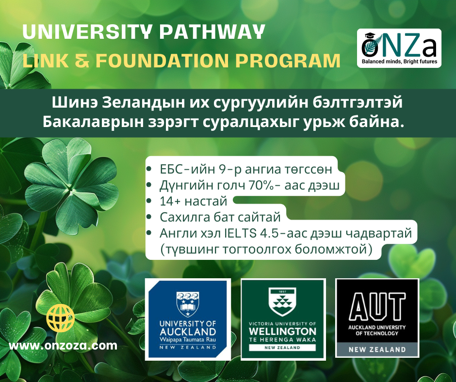 Учир нь таны хүүхэд ЕБС-ийн 9-р анги төгссөн суурь боловсролын гэрчилгээтэй, 14+ настай, одоо 10-12-р ангид суралцдаг, IELTS 4.5-аас дээш түвшний Англи хэлний мэдлэгтэй бол Шинэ Зеланд улсад их сургуулийн суурь (Pathway link) ба бэлтгэл хөтөлбөрт (Foundation connect, Foundation studies) суралцаж төгсөөд, тус улсын их дээд сургуулиудын Бакалаврын зэрэгт шууд элсэх боломжтой. Энэ нь цаг хугацаа, мөнгө хэмнэхээс гадна Таны хүүхдийг их сургуулийн оюутны бие даасан амьдрал руу хамгийн бага эрсдэлтэйгээр, алхам алхмаар бэлдэж, амжилттай төгсөх, цаашлаад тус улсын оршин суугч болох боломжийг нь олгож өгнө. Харин та сургалтын төлбөрийг төлөх санхүүгийн сайн төлөвлөгөөтэй байх хэрэгтэй ба үр өгөөжтэй хөрөнгө оруулалт болно гэдэгт итгэлтэй байна.